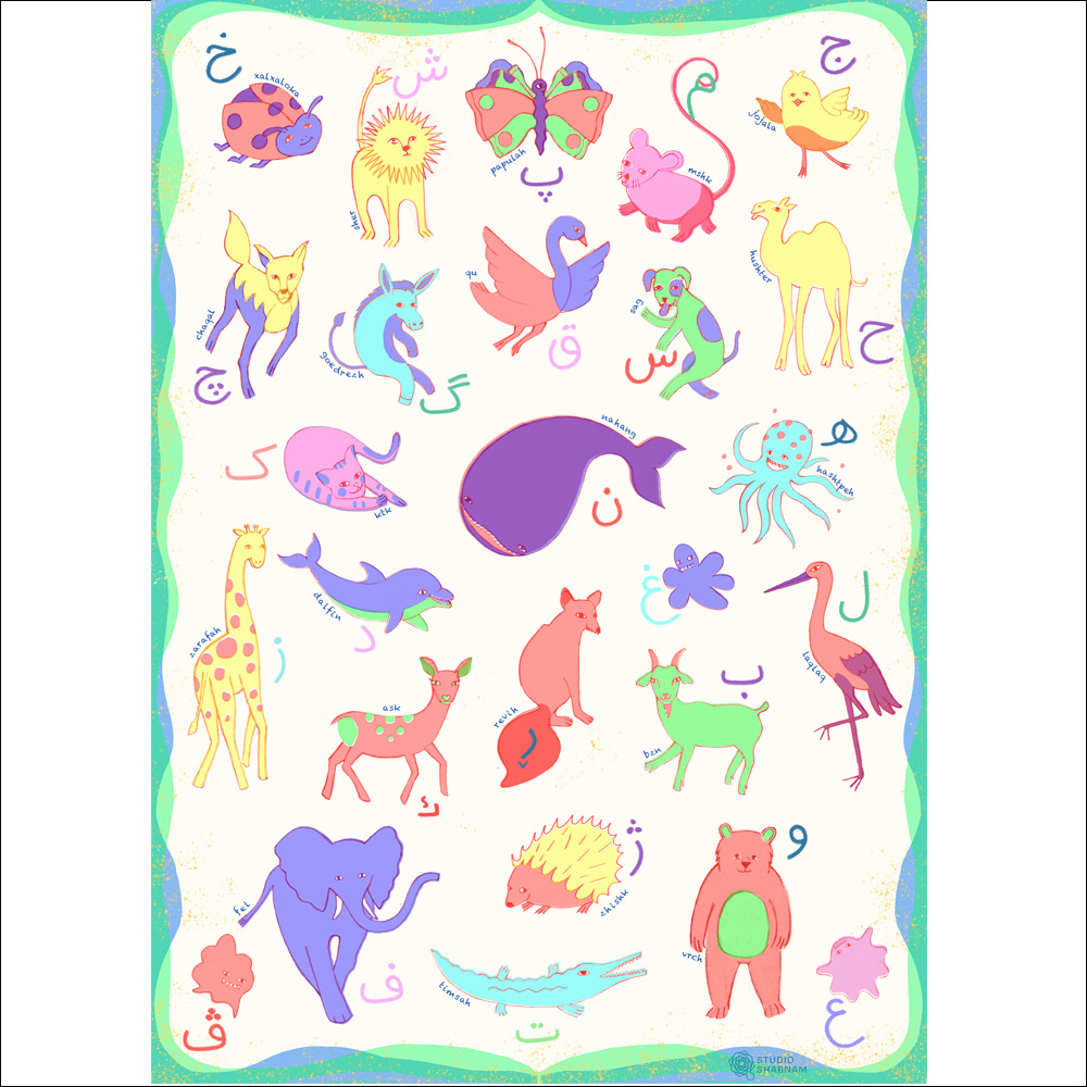 Denna version är på kurdiska och passar perfekt för barn som vill lära sig eller stärka sitt modersmål på ett inspirerande och visuellt sätt. Djurens namn är även skrivna med latinska bokstäver, vilket gör affischen tillgänglig även för föräldrar som inte läser kurdiska.