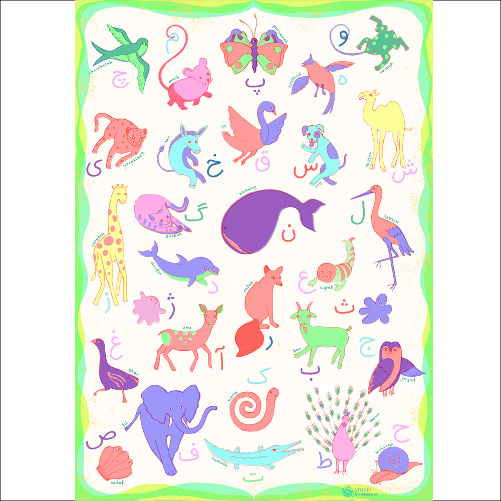 Denna version är på persiska och passar perfekt för barn som vill lära sig eller stärka sitt modersmål på ett inspirerande och visuellt sätt. Djurens namn är även skrivna med latinska bokstäver, vilket gör affischen tillgänglig även för föräldrar som inte läser persiska.