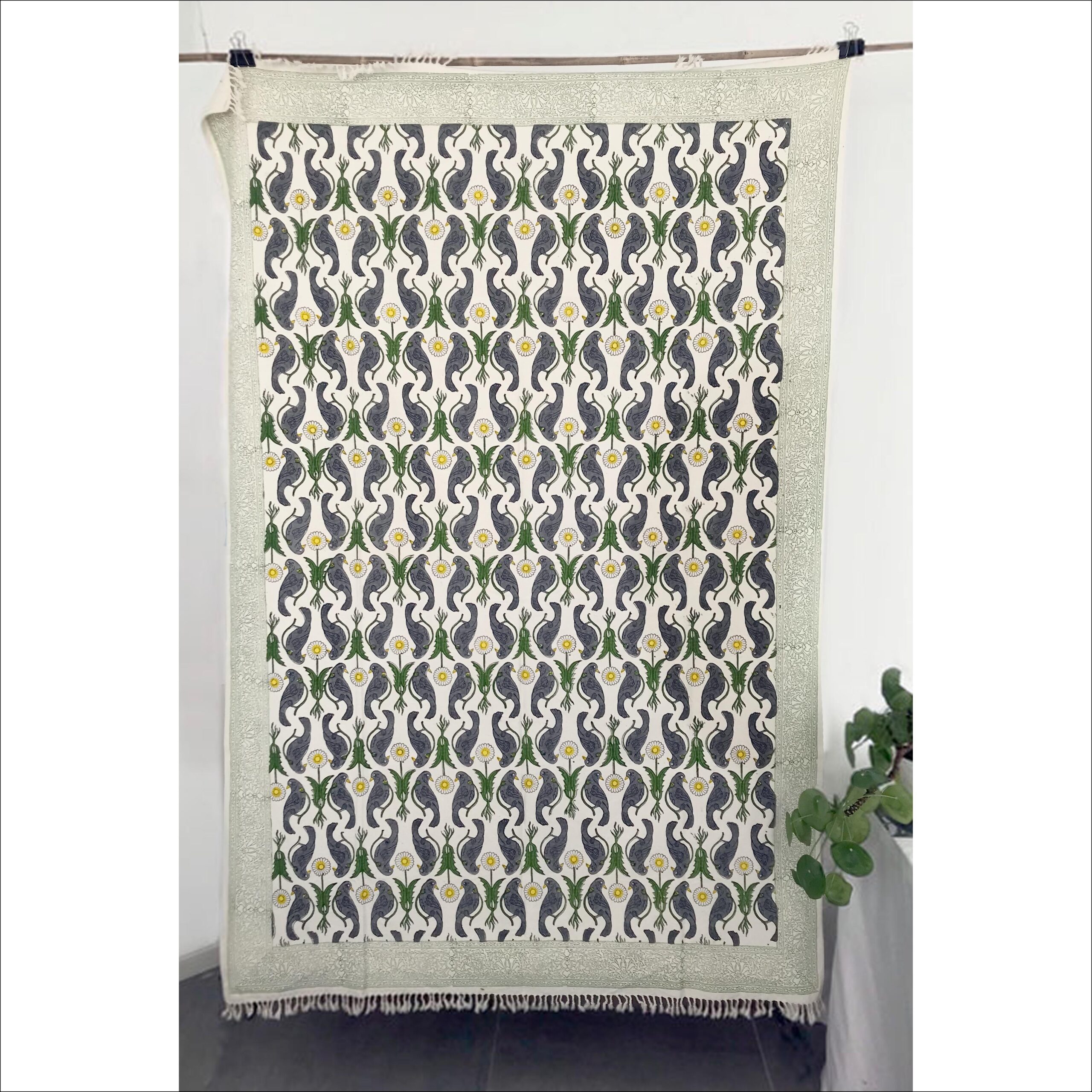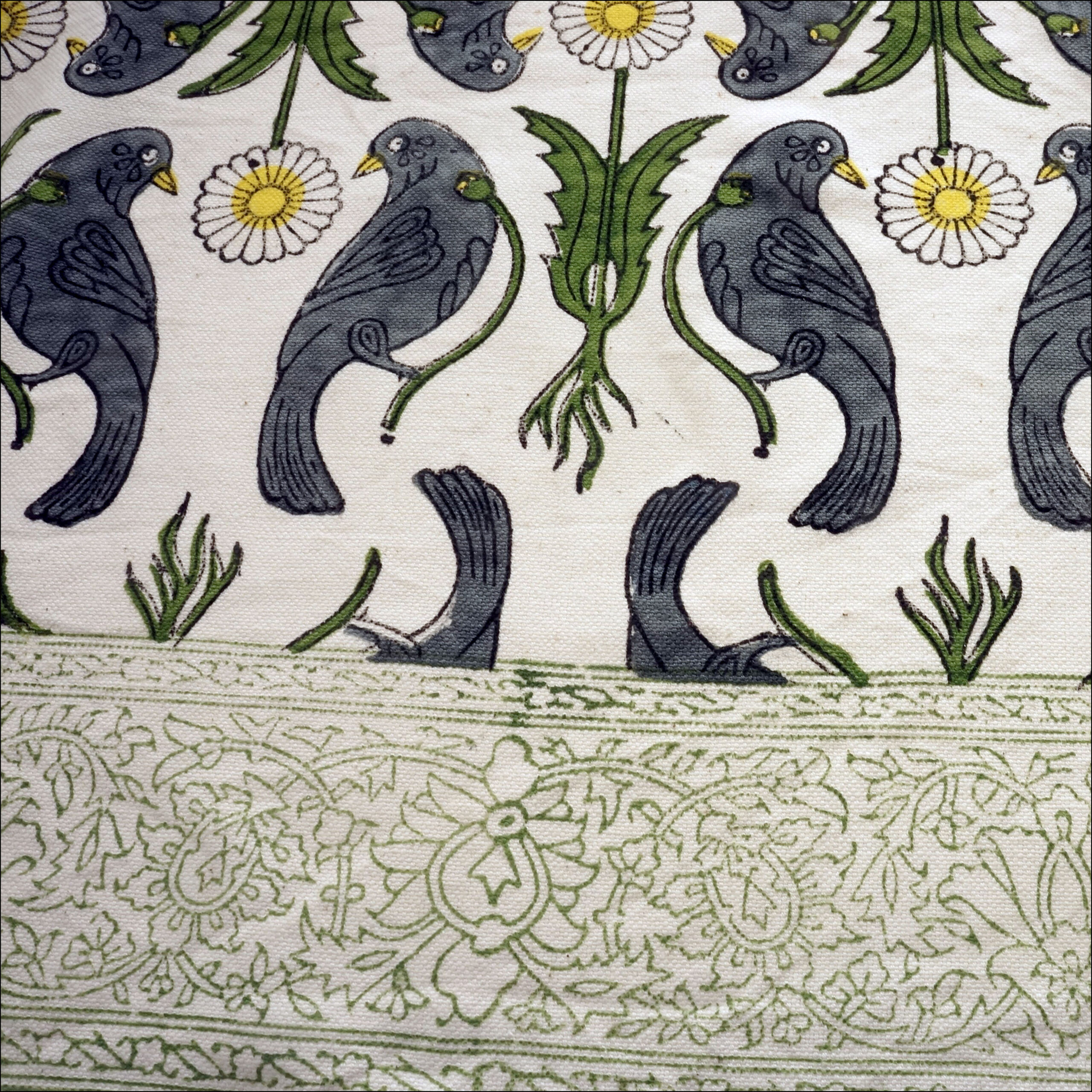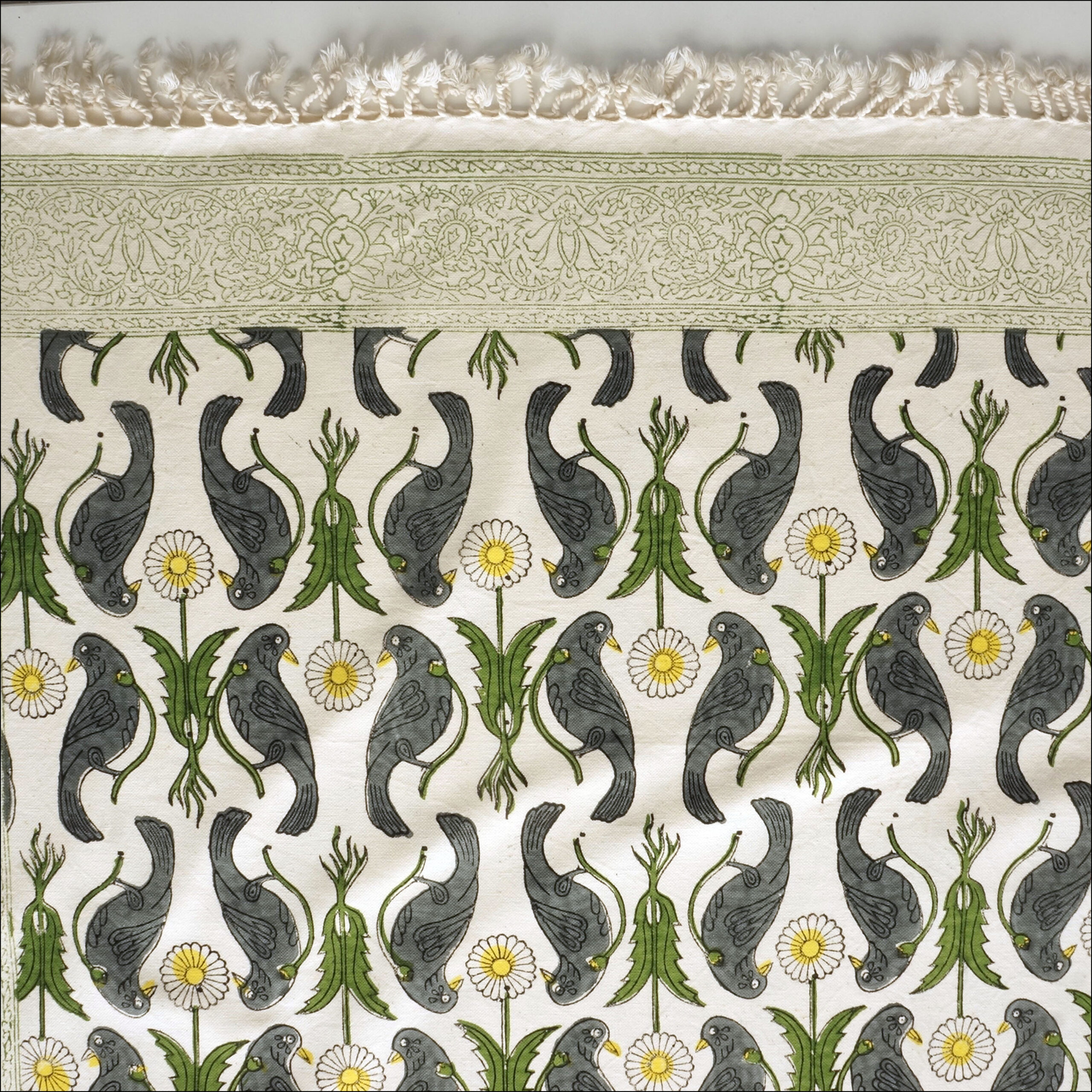 Handtryck duk på tjockt bomullstyg med fransar med en bård av blommor