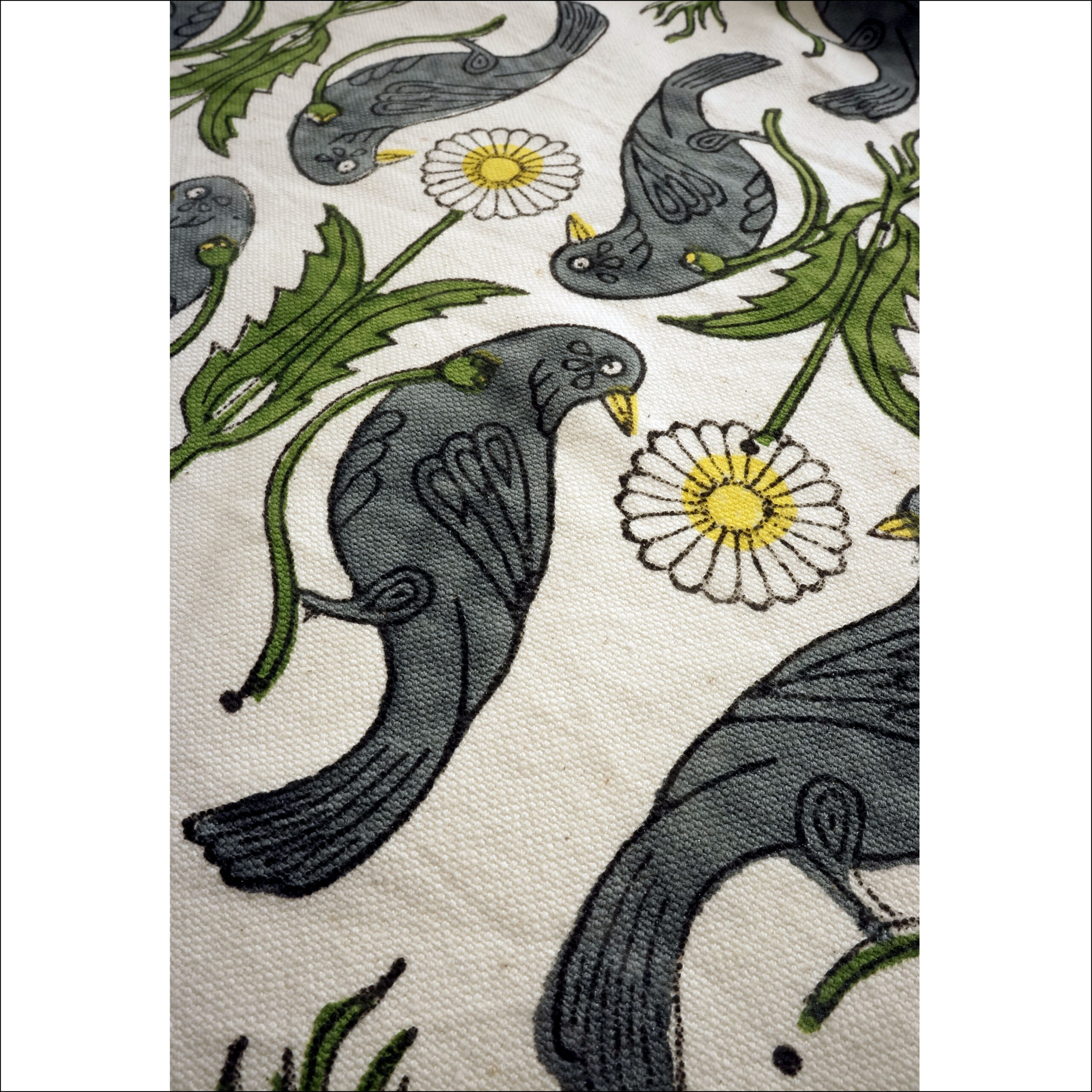 Det är vanligt med mindre färgfläckar och misspassningar när man trycker med träblock. Det gör textilen levande och organisk.