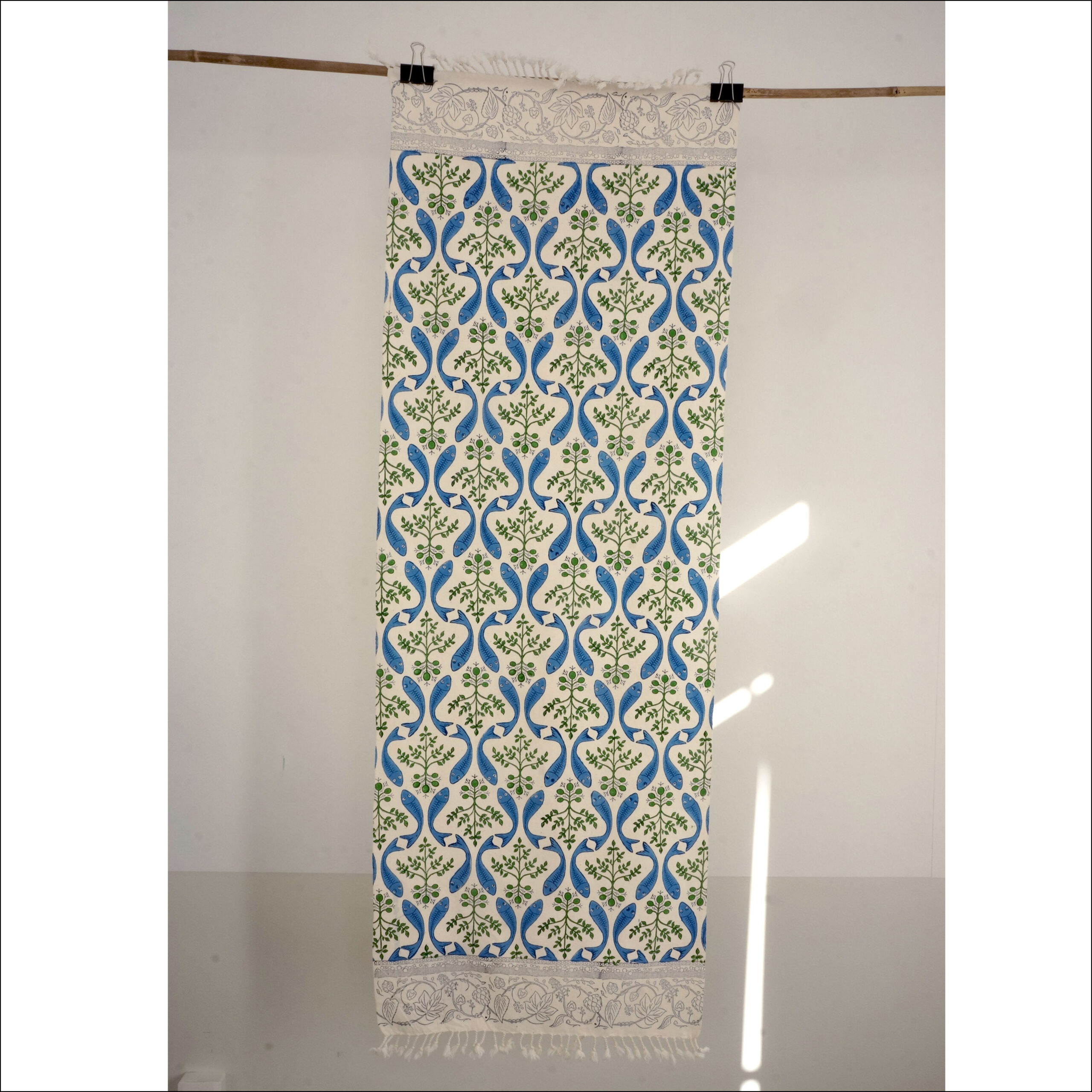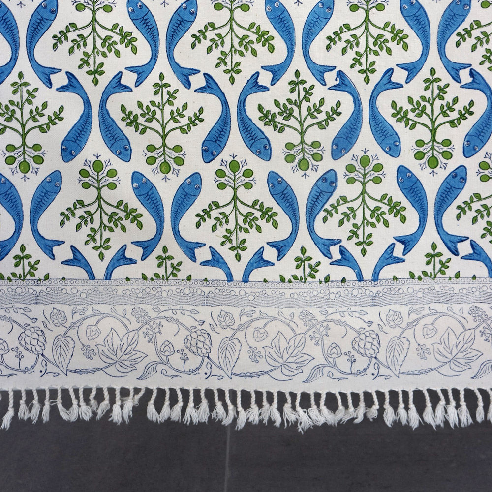 Handtryckt duk på tjockt bomullstyg med fransar. Mått 150 x 50 cm